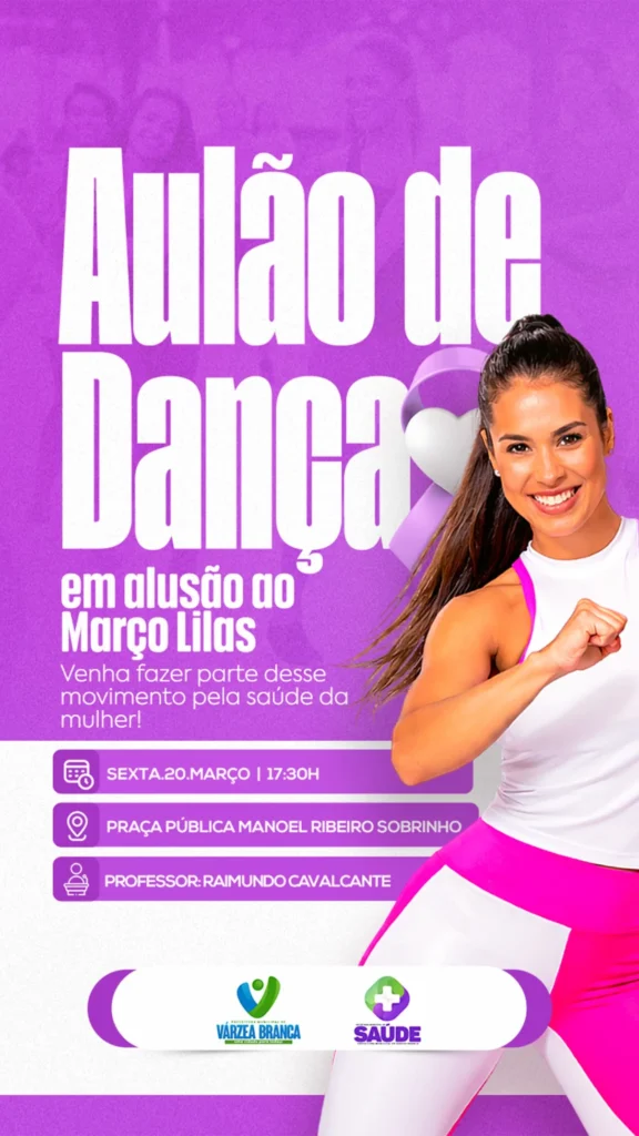 A Prefeitura Municipal de Várzea Branca, por meio da Secretaria Municipal de Saúde, convida toda a população para participar de um Aulão de Dança em alusão ao Março Lilás, movimento voltado à conscientização sobre a saúde da mulher.