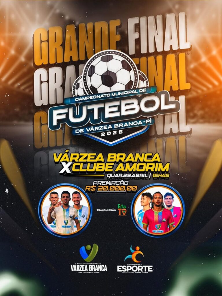 A Prefeitura Municipal de Várzea Branca, por intermédio da Secretaria Municipal de Esporte, informa à população que será realizada a grande final do Campeonato Municipal de Futebol Edição 2026, reunindo os dois melhores times da competição. A partida decisiva ocorrerá no dia em que o município celebra seus 34 anos de emancipação política, integrando as comemorações oficiais do aniversário da cidade.