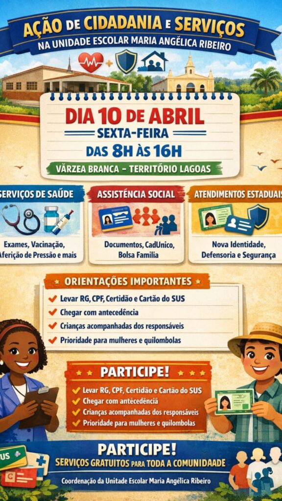 A Prefeitura Municipal de Várzea Branca, por meio da Secretaria Municipal de Saúde, convida toda a população para participar da Ação de Cidadania e Serviços, que será realizada no dia 10 de abril (sexta-feira), das 8h às 16h, na Unidade Escolar Maria Angélica Ribeiro, no Território Lagoas.